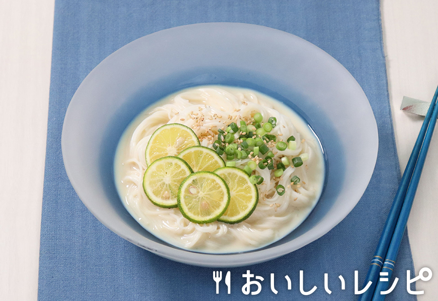 - すだち香る冷やし豆乳そうめん冷たい豆乳スープで食べる絶品そうめん。すだちの爽やかな香りが心地よい、夏にぴったりの味わい。