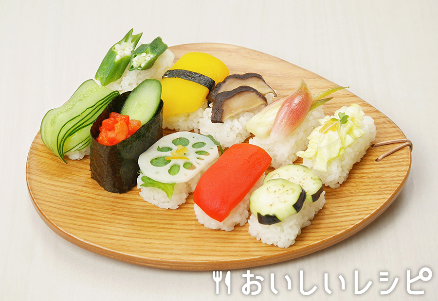 - やさいのおすし色とりどりの握り寿司、実はすべて野菜のネタで作りました! 魚介が苦手な方にもオススメのお寿司です!