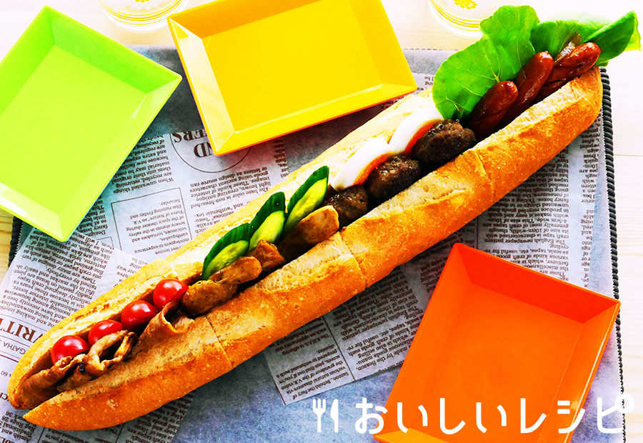 - ロングバゲットサンド長~いバゲットにたくさんの具材をはさんで! 盛りあがること間違いなし!